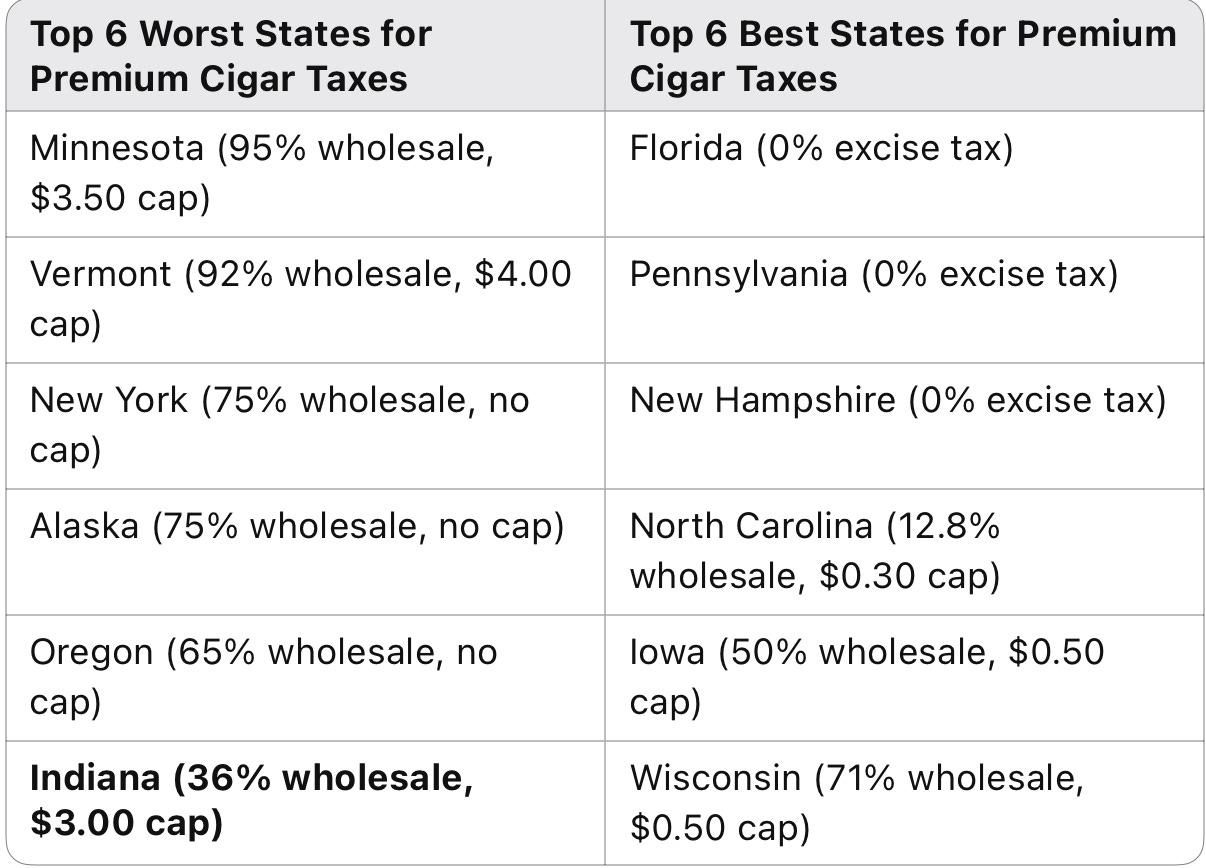 Premium cigar businesses already operate in a challenging environment, facing federal excise taxes and standard state sales taxes. Piling a new 36% wholesale tax on top — capped at $3.00 per cigar — will place Indiana among the worst states in the nation for premium cigar taxation.