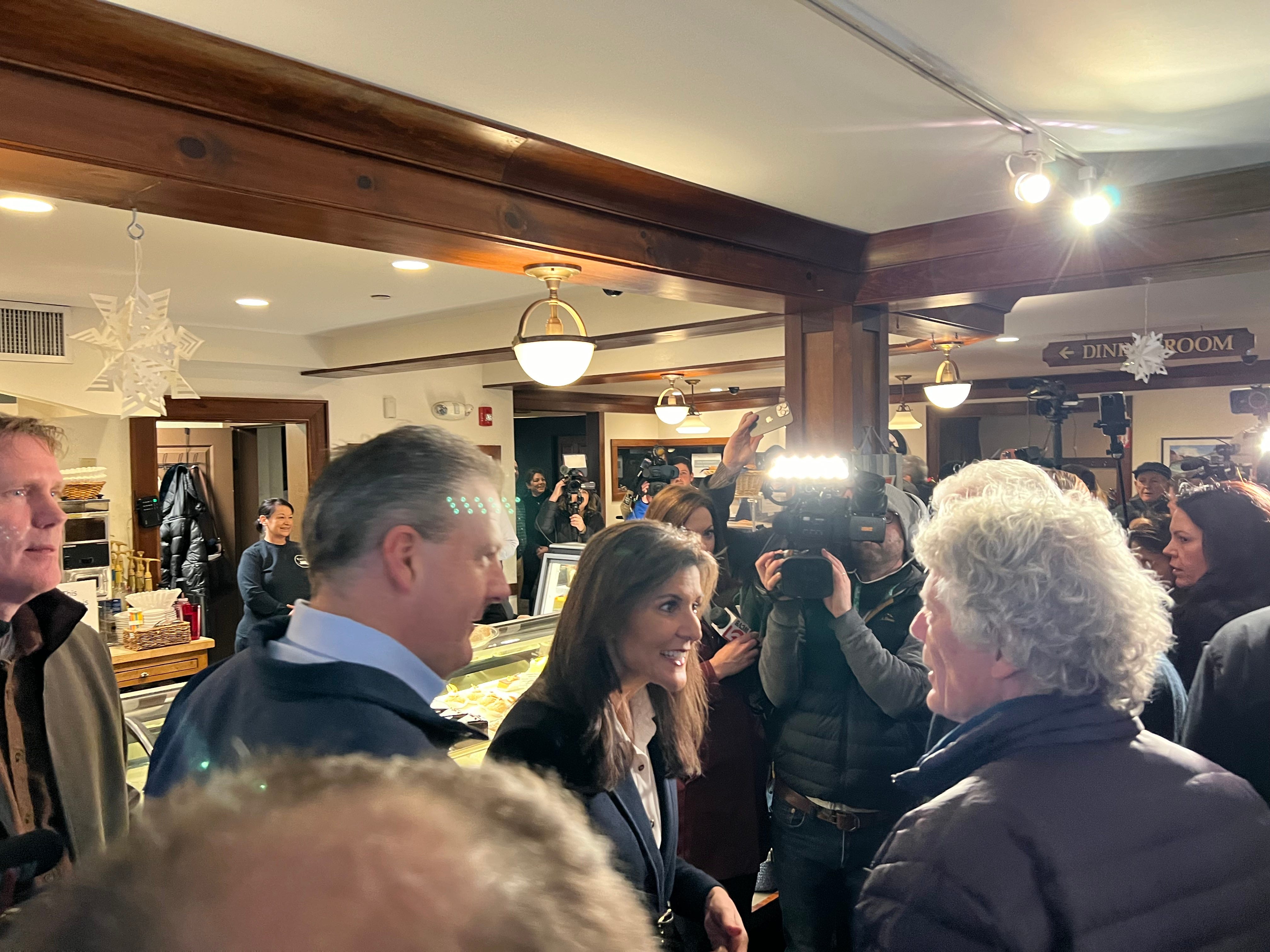 “This is New Hampshire politics at its best, we just happened to show up,” said Peggy Chidester, 70 of Hampton, N. H., who stopped in for a coffee with her friend, Cathy Lodico, 71 of Hampton, N.H. “I was leaning toward Nikki Haley before the event, seeing her here solidified my vote. So I’ll be voting for her on Tuesday.”