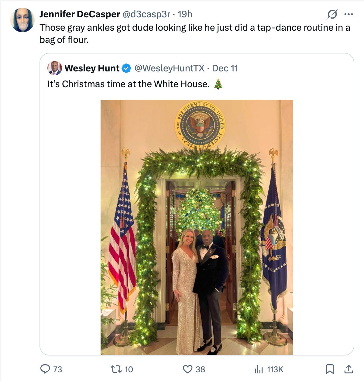 The incident involves Jennifer DeCasper, executive director of the NRSC and a Black woman, who posted a comment mocking a photo of Hunt and his wife at the White House, writing: “Those gray ankles got dude looking like he just did a tap-dance routine in a bag of flour.”